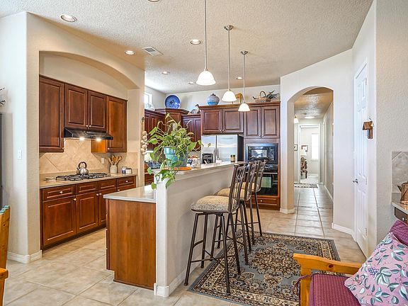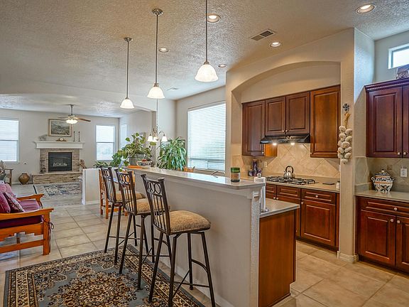 Single story 5 bedroom 3 full bath and 3 car garage in Diamond Ridge all on a corner lot! Two living areas with formal dining and eat-in kitchen. 11 foot ceilings throughout ...Kitchen offers lots of space and cabinets with large island, solid surface quartz, gas stove top all open to second living area with gas fireplace. Split floorplan with large master bedroom wing, dual sinks, jet tub and walk-in shower and closet. Outdoor living with xeriscape landscaping, pond and views of the Sandias! Dual zone refrigerated air. Wont last long, call to schedule your showing today.