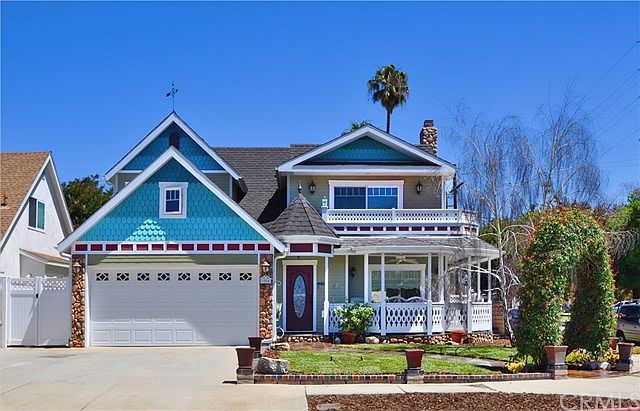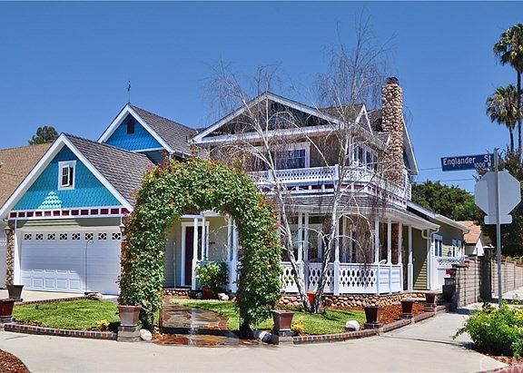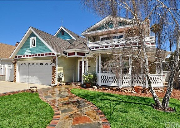 This one of a kind 4 bedroom, 2 bath, 2,623 square foot home is adorned with colorful scalloped accents, river rock, enchanting rose arbor, and slate/brick pathway leading to the entry and wrap-around decorative vinyl front porch. The downstairs level offers a charming formal living room with view of a beautifully landscaped front yard, has a used brick-faced fireplace with a lighted ornate mantle and opens to an extended dining area. Enormous family room has a charming fireplace, alder built-in cabinets with sliding glass doors leading to landscaped enclosed yard, featuring tranquil sounds of the French water fountain for outside entertaining on the patio. Kitchen highlights an island, vegetable sink, magnetic induction cook-top, and spacious eating area with view of backyard. First level also offers full bathroom, spacious bedroom with mirrored wardrobe, walk-in laundry room, and direct entry to over-sized double car garage. Upstairs features 3 bedrooms with ceiling fans, plus 1 bathroom with ample linen closet. Two of the bedrooms are large with roomy walk-in closets. The other upstairs bedroom is enormous with vaulted ceiling, unique triangular windows, large mirrored wardrobe, and sliding glass door opening onto a wrap-around front balcony. More features include central air-conditioning, solid oak hardwood floors, dual pane vinyl windows, crown molding throughout, ceiling fans, recessed lighting, and much more! Desirable neighborhood in San Pedro. Must see to appreciate!