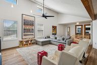 Privacy fenceHot tub deckElegant foyerTile flooringUpdated one-story homeCeramic plank flooringPainted brick fireplace