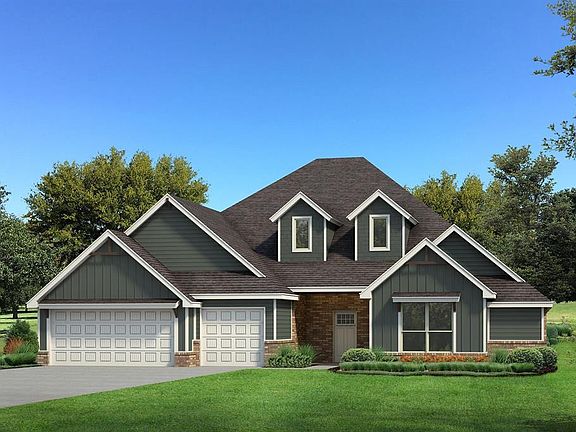 This Rhody floor plan includes 3,590 Sq Ft of total living space, which includes 3,100 Sq Ft of indoor living space and 490 Sq Ft of outdoor living space. There is also a 590 Sq Ft, three-car garage with an in-ground storm shelter. Home offers 4 bedrooms, 3 full bathrooms, a powder room, a mudroom, a utility room, and plenty of storage opportunities. The massive living room welcomes 3 large windows, wood-look tile flooring, a gas fireplace surrounded by our stacked stone detail, Cat6 wiring, and high ceilings with a ceiling fan. The outstanding kitchen offers cabinets to the ceiling, exclusive pendant lighting, a center island, 3 CM countertops, stainless steel appliances, modern kitchen backsplash, and a walk-in kitchen pantry. The Rhody is arguably one of our most unique floor plans, thanks to the TWO primary bedrooms! Both suites support a sloped ceiling detail with a ceiling fan, carpeted flooring, windows, and Cat6 wiring. The attached baths boast separate sink vanities with framed mirrors, 3 CM countertops, tile flooring, a European walk-in shower, a private water closet, and a free-standing tub. Outdoor living welcomes a wood-burning fireplace, a gas line, and a TV hookup.
