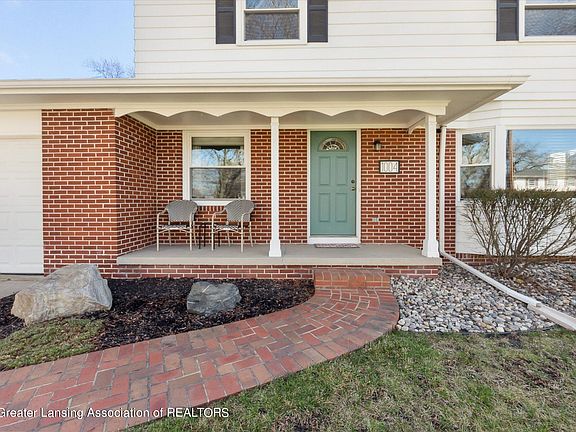 Meticulous care and pride of ownership is evident throughout this squeeky-clean Colonial, located in the desired East Lansing School District. This home is just minutes to MSU, Downtown Lansing, and much more! A covered front porch greets you as you enter the home to a spacious living room with gleaming refinished oak hardwood floors. Follow the seamless flow of oak hardwood into the formal dining room, where memories are destined to be shared over sumptuous meals. The heart of this home, the kitchen, has been modernized with white painted cabinets, updated countertops, and newer appliances. A bay window brings in the warm morning sunlight into the eat-in kitchen, making it the perfect spot for a coffee. Adjacent to the kitchen, a cozy family room beckons, complete with a captivating stone fireplace. Slide open the door to reveal the enchanting patio, offering a sanctuary for al fresco dining or watching your furry friends enjoy the fully fenced yard. Upstairs you will find four bedrooms, each boasting hardwood floors. The full bathroom has been updated with a new tub and surround, updated vanity, and newer flooring. The finished basement offers a rec room area, complete with a basement bar. Other features include a two-car attached garage, walk-up attic, fully fenced yard, newer water heater, newer windows on the front of the house, and more!