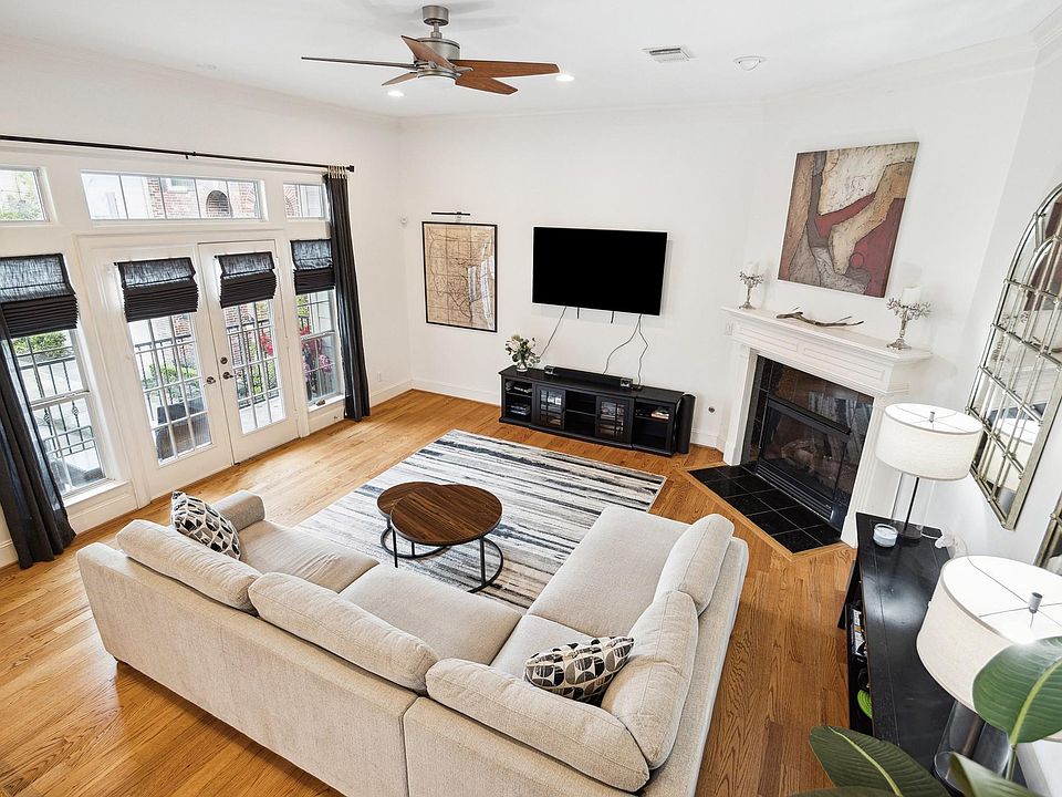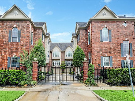 Charming all brick home in a desirable gated Montrose community—just steps from premier dining, local shops, and the green spaces of Buffalo Bayou Park. Smart floor plan with ample storage space throughout, blends sophisticated finishes with thoughtful functionality. First floor features gracious foyer and ensuite bedroom overlooking patio. One of the few homes in the community with a private side yard and patio—ideal for entertaining or enjoying time with pets. Second story boasts high ceilings and open concept living, with rich hardwoods. Kitchen appointed with s/s appliances and oversized dining island. Living area boasts focal point fireplace and wall of french doors and windows opening to recently remodeled balcony, extending the living space outdoors. Third floor features an expansive Primary suite with spa like bath and oversized closet. Large bonus room off the primary serves perfectly as a study, nursery, or space for guests. This home is priced to sell - must see!