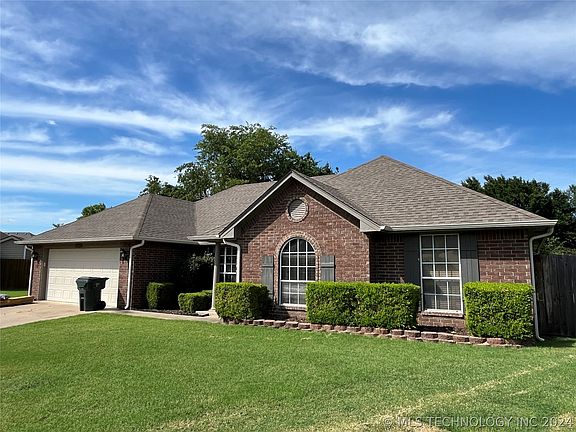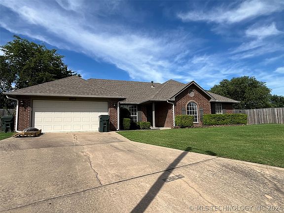 This 3 bed, 2 bath, 2 car, brick home on the east side of Muskogee is on a quiet cul-de-sac on over 1/2 acre lot, fully fenced with storage building, covered patio and extended patio area. Stainless steel appliances. Granite, beautiful wood flooring in living, office and hallway. Nice neutral colors throughout. Great office space off of living area for those wanting to work from home.