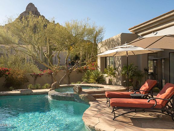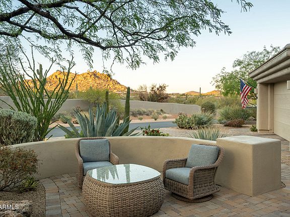 Enter through a charming front courtyard framed by sweeping views of Pinnacle Peak. Inside, the light-filled layout features three bedrooms plus a dedicated office, easily convertible to an additional ensuite if desired.
