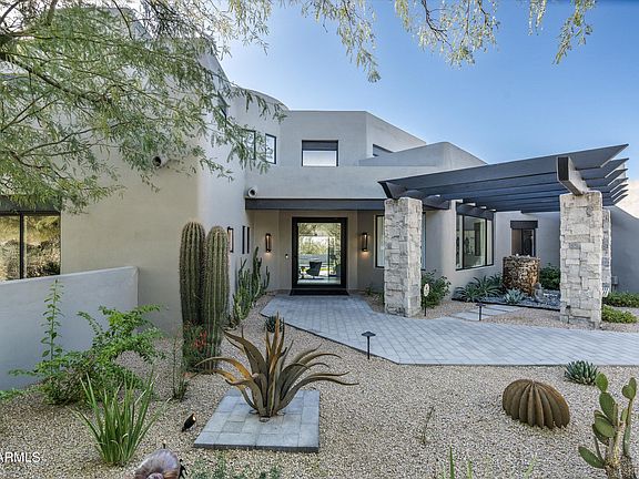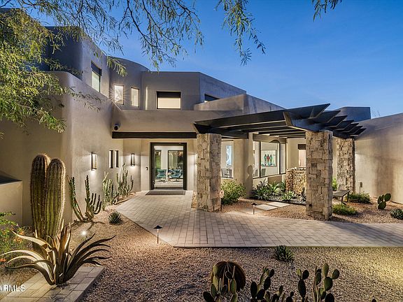 Blending modern zen with desert living, this beautifully rebuilt and reimagined 4,365 sq. ft. residence is an entertainer's sanctuary, thoughtfully designed for seamless indoor/outdoor living. Offering immediate golf membership at close of escrow, this 4-bedroom home, including a detached casita, exudes quality, dramatic design, and timeless sophistication. Backing the 3rd fairway, it offers a perfect blend of golf course views, breathtaking sunsets, and sparkling city lights. The private backyard retreat features a heated pool and spa, 700 sq. ft. of covered patio, a spacious turf area, outdoor kitchen/BBQ, and a sleek linear fire pit, creating the ultimate setting for year-round entertaining and an unparalleled living experience.