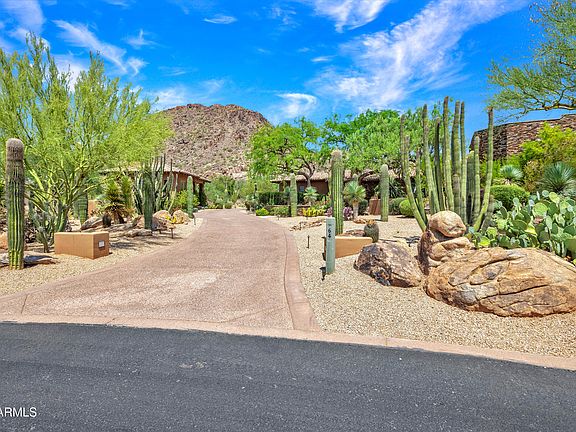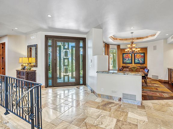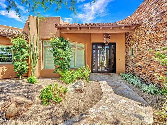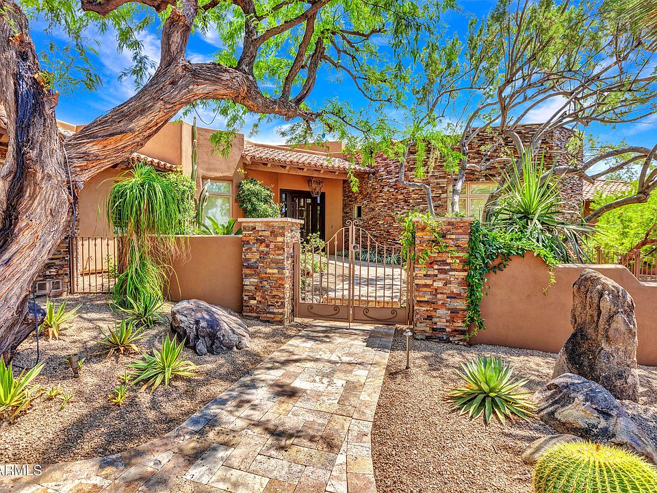 The charm, comfort, & quiet elegance of this outstanding furnished home is evident from the moment you enter the gated courtyard entry. Nearly every room offers a view ~ The main house features a great room floor plan, 3 ensuite bedrooms + a private office, powder room, formal dining, gourmet kitchen w/breakfast. The casita offers a living room, bedroom, bath with laundry. The grounds of this property are as enchanting as the home itself with $250,000 worth of landscape design by Trademark Landscaping. The outdoor living, overlooking the unique setting along the 18-hole Desert Highlands putting course, offers expansive and intimate patios, a heated pool and spa with cascading waterfall, gas firepit + fireplace, and outdoor living room with shade pergola and heaters.