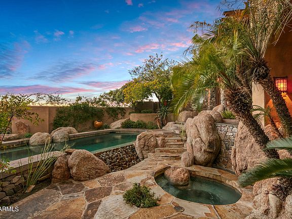 Embrace elegance on the 17th fairway of the renowned Desert Highlands Golf Course. Enjoy immediate access to FULL CLUB Privileges in this 5 bed/5.5 jewel box home designed by Allen Tafoya, in built by Rick Merritt-built 5 bed/5.5 with interiors by Billi Springer. This old-world inspired home features an open floor plan, blending exquisite finishes with functional luxury. The expansive layout includes a grand master suite, a dedicated exercise room, and a versatile upstairs office. Every space is crafted with precision, harmonizing indoor comfort with serene golf course views. Experience sophistication in this stunning home, where lifestyle, luxury, and exquisite craftsmanship meet. The upstairs Study has outstanding city light views. The main level frames Pinnacle Peak.