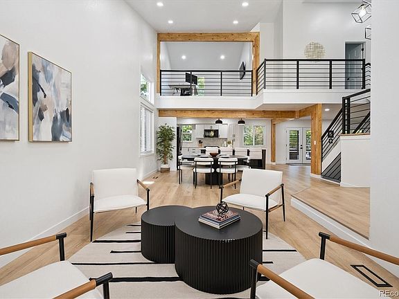 Welcome to this beautifully remodeled home in the Centennial Ridge neighborhood of Lone Tree. Located on a quiet cul-de-sac, this property wows upon entering with 2 story ceilings. Brimming with natural light from ample windows and skylight, the open layout flows seamlessly through living, dining and family room areas on the main level. The kitchen, which features a massive center island and quartz counters, offers white shaker cabinets with dark appliances and designer accent colors. The main level offers a mudroom area coming in from the 3 car garage, and easy access to the spacious deck out back, complete with a modern pergola and gas fireplace. Upstairs you'll find an office loft overlooking the main level, plus 3 spacious bedrooms and two full baths. The primary bedroom boasts massive windows, vaulted ceilings, a fireplace, a walk-in closet, and a stunning 5-piece ensuite bath. Downstairs in the basement is a media room with a full bar and wine cooler, a fourth bedroom, and a full bath. This home has been meticulously renovated from top to bottom and is move-in ready.