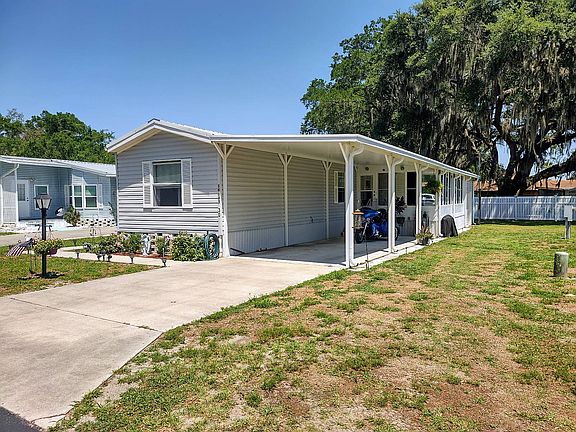Split plan home has all new waterproof plank flooring. Large bedrooms, master bath has a step in shower, and both bathrooms have new highboy toilets. Living room is spacious with cathedral ceilings. Florida room is 12x24 which also has new flooring. Carport is 12x32 which provided a large amount of covered parking. There is also a large garage/workshop. Home also has a nice private yard. Community is very friendly and close to shopping and Webster market. Lot lease is low and includes lawn, water and sewer. Start soaking up the sun in Sunshine Village. LB10495