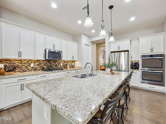 Active adult living at its best, this highly sought after Emmy plan is an entertainers delight and features 2 lg en-suites, a 1/2 bth+den+ flex rm. The large multi slider is the focal point of the great room leading to the expanded paver patio with wraparound pergola with raised flower beds framing the extended patio, complemented by easy maintenance mature landscape with several fruit trees. This home has OWNED SOLAR system with battery backup and no electric bill for the last 9 months. The extended 3 car garage is a dream garage that includes storage cabinets & a mini-splits for year-round comfort. Most of the home was recently painted. The spacious kitchen is nicely upgraded with 42'' raised panel cabinets, glass tile backsplash, & granite countertops. The lg island features seating... ...& decorative pendant lights, while the SS wall ovens & gas cooktop, lg W-I pantry provide the perfect setup for the home chef. The nook also has extended cabinets, Each of the two private en-suites feature a walk-in closet, raised vanity, separate shower, & soaking tub. The primary bathroom boasts a tiled surround at the soaking tub & shower, with an upgraded pebbled floor. A separate laundry room includes upper & lower cabinets with a utility sink. The home sits on an oversized premium corner lot and the exterior of the home showcases a stunning, upgraded rock elevation with an expanded front entry & pony wall. The wrought iron front screen door adds a touch of elegance to the entryway. This home is a must see!!!