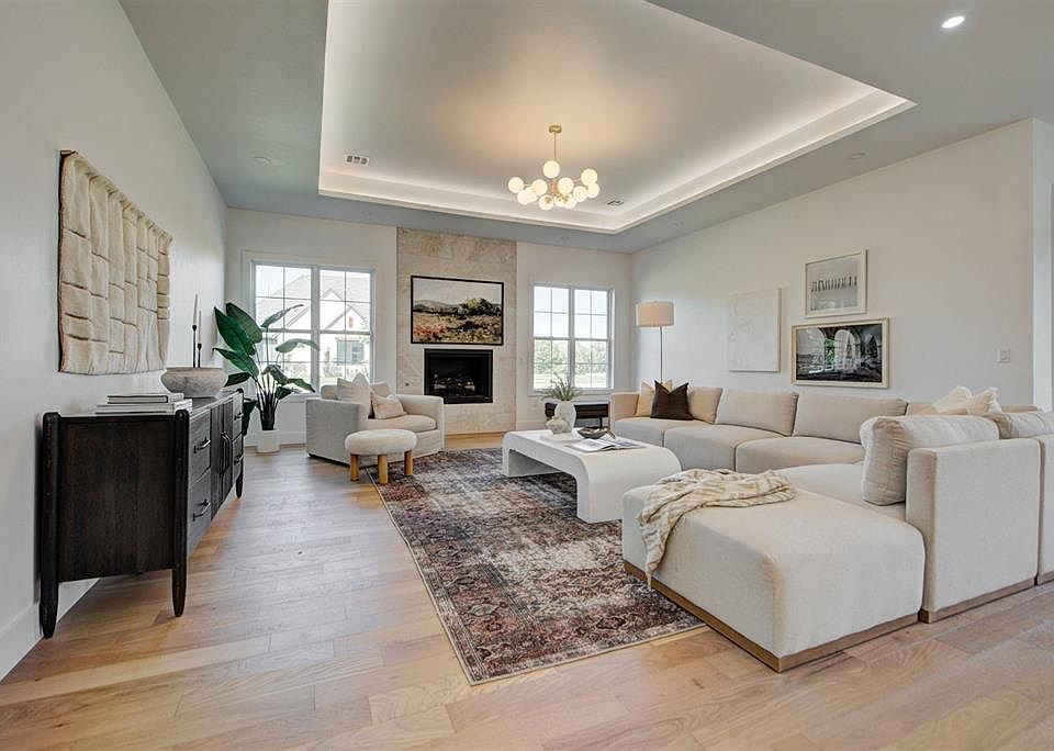 Enter through the gates into a sanctuary of elegance and privacy, where every detail has been curated for elevated living. Mornings come alive in the sun-filled kitchen, where an oversized 12' quartz island and custom White Oak cabinetry with hidden storage make preparing coffee or weekend brunch a delight. The kitchen flows seamlessly to the living room, anchored by a floor-to-ceiling stone fireplace and tray ceilings that enhance the architectural drama of the space. Evenings invite relaxation in the primary suite, featuring sliding glass doors to the backyard and a spa-inspired bath with dual vanities, a freestanding tub (installation scheduled in approximately two weeks), and a spacious glass-enclosed shower. The primary closet adds a touch of everyday indulgence with a built-in makeup vanity, full-size mirror, and integrated lighting.