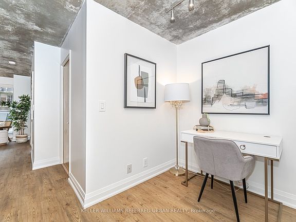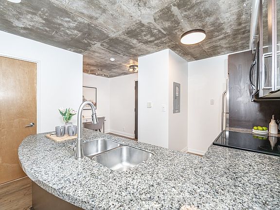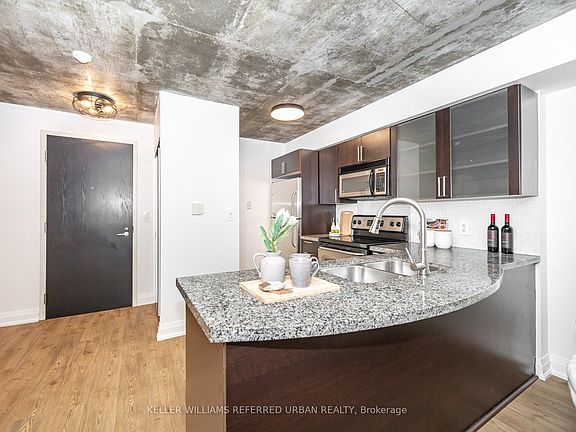 Welcome to DNA Lofts at 1005 King St W, where modern design meets urban sophistication in the heart of one of Toronto's most dynamic neighbourhoods. This stylish one-bedroom + den suite offers a bright, functional layout with new flooring, fresh paint throughout, and exposed concrete ceilings that give the space a true loft vibe. The spacious den provides the perfect flex space for a home office or reading nook. The primary bedroom features a semi-ensuite entrance to the 4-piece bath. The contemporary kitchen is equipped with modern cabinetry, granite counters, double sink, breakfast bar, and full-sized appliances, flowing seamlessly into the open living and dining areas. Off the living area you have a walk-out to a private patio. Perfectly positioned in King West, you're surrounded by some of the city's best amenities. Trinity Bellwoods Park, Stanley Park, and the Waterfront Trail offer green escapes just minutes from your door. Trendy cafes, acclaimed restaurants, boutique shops, and daily conveniences line the neighbourhood, while excellent transit options, including the King streetcar, make getting around the city effortless.