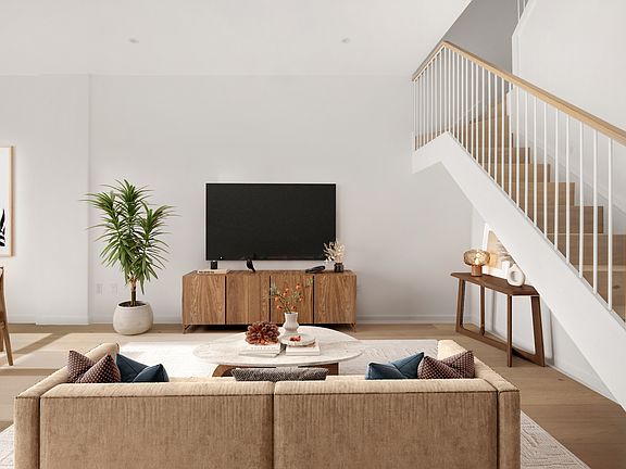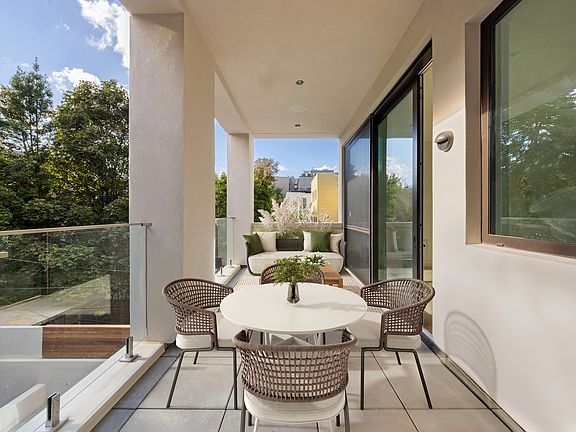 Inside this 1,698-square-foot, new-construction condominium, ceilings soar over 10 feet high above pristine wide-plank wood floors and walls of glass. A gracious foyer flanked by two large coat closets nods to the generous storage found throughout. Ahead, the open-plan living/dining invites you to relax and entertain alongside extra-large sliding glass doors that open to your peaceful covered terrace boasting sunny southwestern views over the rear garden and plenty of room for a large dining table. The U-shaped gourmet kitchen features sleek Italian cabinetry, crisp white countertops and all-new upscale appliances, including a vented 36-inch Bertazzoni range with a pot filler, cabinet-front Miele refrigerator, Bosch dishwasher, and a large pantry with a microwave.