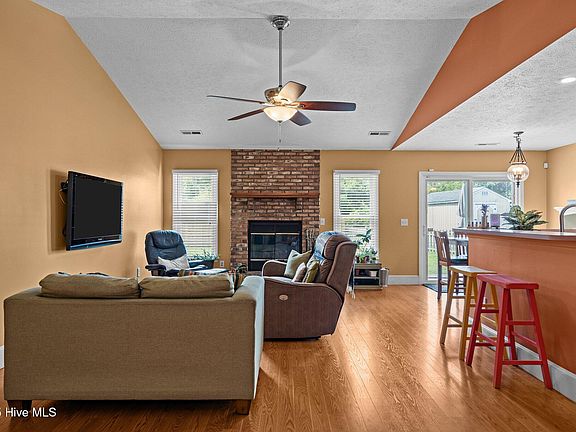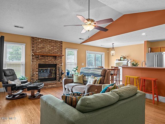 Conveniently located near shopping and restaurants, this home is just a short drive from both Carolina and Wrightsville Beaches, as well as vibrant downtown Wilmington and it offers a great blend of space and comfort. A small covered front porch welcomes you inside to a large living room featuring a vaulted ceiling and a cozy brick fireplace—perfect for relaxing or entertaining. The kitchen includes bar seating and opens to a bright dining area with sliding glass doors that lead to the fenced backyard and patio, ideal for outdoor enjoyment. The primary bedroom features an en suite bath with a walk-in shower, dual sink vanity, and a walk-in closet. Two additional bedrooms and a second full bath provide plenty of space for family or guests. A large bonus room offers flexibility—perfect as a home office, fitness area, or additional living space. Covered parking, and a storage shed provide space for all your outdoor gear. There is also an irrigation well for economical lawn care. This home checks all the boxes!