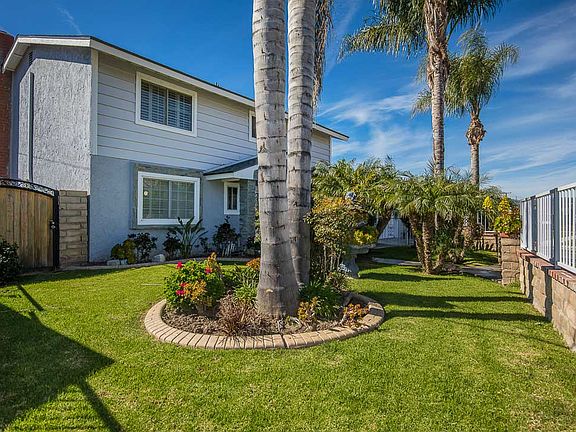 Welcome home to this charming 4-bedroom, 2 bathroom, approximately 1998 sqft, pool home. This two-story home has a tropical gated courtyard with palm trees & inlaid glass beveled front door. Also has owned solar, dual-pane windows, smooth ceilings, recessed lighting, and plantation shutters throughout. As you walk in downstairs you will find ceramic tile floors, living room with cozy marble fireplace, and guest bedroom with full bathroom. The kitchen features granite counters, greenhouse window, pantry and is open to the large dining room or possible family room. Upstairs has woodlike floors throughout, 2 nice-sized secondary bedrooms with ceiling fans & mirrored closet doors, hallway bathroom with dual granite vanities & combination bathtub/shower, and at the top of the stairs there is a large closet with a French door currently being used as a small office. Master bedroom is quite large with 2 closets, one which is walk-in. Backyard is your own private tropical oasis and perfect for entertaining with a huge, heated pool and diving board, built-in barbeque with granite counter & refrigerator, screened-in patio room wired for cable, and has a grassy area with multiple palm & fruit trees. Finished 2-car garage with lots of cabinet storage on the side. This is the one you've been waiting for, welcome home!