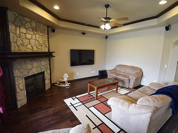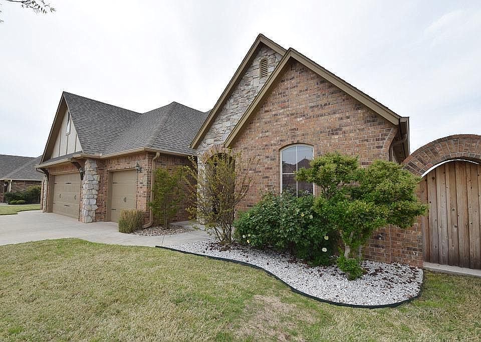 Welcome to this South Moore stunner! With easy highway access, you're just minutes away from OKC, Norman and Tinker Airforce Base! This home will instantly grab your interest with its unique, stately appeal! The beautiful brick archways, stylish stone work and neatly kept landscape lend a curb appeal that will keep you smiling! And that's just what's out front! Come on in and you won't be disappointed! As you enter, you'll instantly notice the abundance of inviting natural light and rich wood accents! To your right, through the French doors, is the study/4th bed as well as a conveniently located half bath and second level access. Next we find the wide open living area, complete with high tray ceilings, stone fireplace and warm wood floors! Through the serving window you'll see the spacious kitchen blessed with granite countertops, stainless appliances, a free-standing island with second sink and tons of storage all decked out in knotty Alder wood cabinetry! Connecting the living area and the kitchen is a cozy dining area bathed natural light, with large tile floor and easy patio access! The master suite is sure to please with its lush carpeting and convenient exterior passage way! The master bath is filled with luxurious accommodations such as dual vanities, a jetted tub and large walk around shower! The sizeable walk-in closet also boasts seasonal storage and dresser! From there you have direct access to the laundry/mud room, with its brick tile accents, extra storage and sink station. This well-equipped utility room leads you full circle back into the main kitchen area! Upstairs, you'll find a cozy nook with built-in desk and overhead storage that leads to the secondary bedrooms. These quarters are filled out with their own walk-ins, ceiling fans and are joined by another full bath! The beautiful back yard offers room to run and comes with covered patio and multiple access points! A three car garage offers in ground storm shelter and a decked floor attic provides ample extra storage! Extras in the home include a tankless water system, central vacuum system, and full, built-in alarm system complete with security cameras! This one is the entire package! Call today to schedule your private showing!
