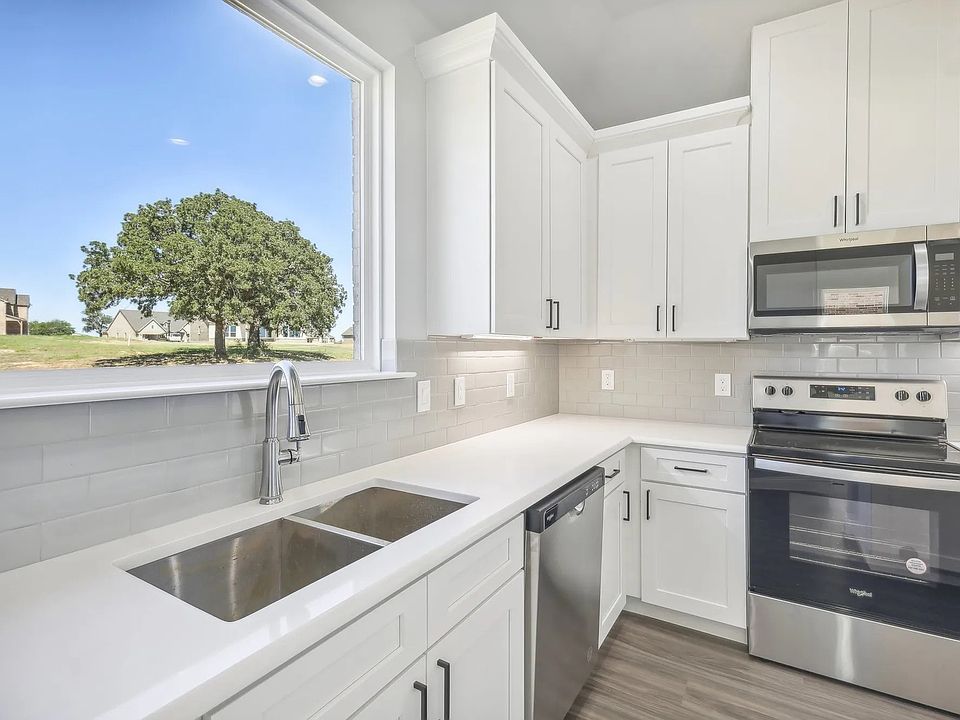 Step into the open-concept kitchen, where you'll find a large island with no sink for uninterrupted prep space, cabinet pulls, and a wide picture window above the sink; providing a stunning view of your open backyard. The cozy living room is anchored by a corner wood burning fireplace, perfect for relaxing evenings at home.