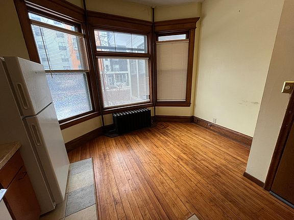 Hardwood and terrazzo floorsNew fridgeWindows with historic woodwork