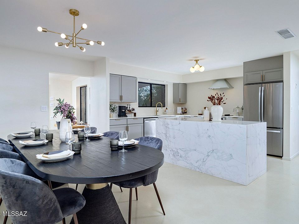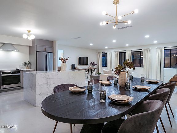 Experience the pinnacle of desert living in this beautifully reimagined residence, set on nearly an acre in the prestigious Sunset Estates enclave of Casas Adobes. Located to capture commanding mountain views from the front yard and surrounded by a lush desert landscape, the property offers an uncommon blend of privacy, scale, and modern sophistication. Step inside and you're greeted by a bright, refined interior where polished concrete flooring and smooth drywall establish a clean, contemporary aesthetic. The great room flows effortlessly into the chef's kitchen, a true centerpiece of the redesign. Marble countertops, custom cabinetry, premium stainless-steel appliances, and layered designer lighting create an elevated space ideal for both everyday living and entertaining. Just beyond, a custom laundry room equipped with Bosch appliances provides stylish convenience.