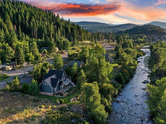 Experience the perfect blend of mountain charm and modern living in this ideally situated home steps from the picturesque Truckee River and the historic heart of downtown Truckee. This home's unbeatable location provides effortless walkable access to a variety of shops, restaurants, breweries, and a plethora of year-round outdoor adventures. Step inside to discover a bright and inviting open floor plan, highlighted by vaulted ceilings and large windows that usher in abundant natural light, accentuating the tasteful finishes throughout. The spacious kitchen is ideal for entertaining, boasting updated appliances, generous counter space, and a seamless connection to the dining and living areas. This property offers flexibility and space with a total of 5 bedrooms and 3 bathrooms. The main house comprises 3 bedrooms, 2 bathrooms, and a game room, while the in-law quarters add an additional 2 bedrooms and 1 bathroom. Enhancements include a new roof, fresh exterior paint. The outdoor space is equally captivating, featuring a large, terraced backyard that leads down to the river, offering approximately 100 feet of riverfrontage. It's perfect for relaxing, gardening, or hosting summer BBQs. Additional highlights include a circular driveway, RV/boat parking, and an oversized garage.