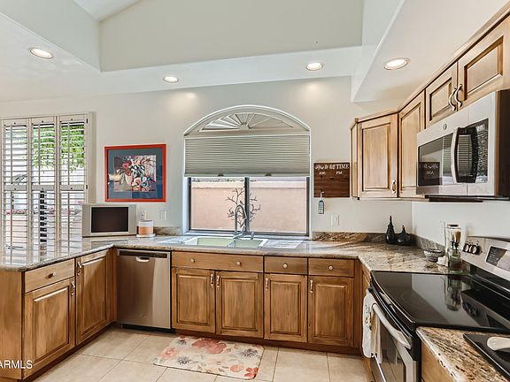 Welcome to guard-gated Las Brisas in Scottsdale Ranch. This quiet, resort style community sits on lovely Lake Serena with boating and fishing within walking distance. The gorgeous lush landscaping is meticulously maintained and there are tennis courts, 3 community pools, spa and dry saunas. This home is fully upgraded and has a private back yard with vined walls. The kitchen features stainless steel appliances, granite tops, tile floors throughout and stone flooring in master bath and walk in shower. Close to restaurants, shopping, parks, hospitals and the 101.