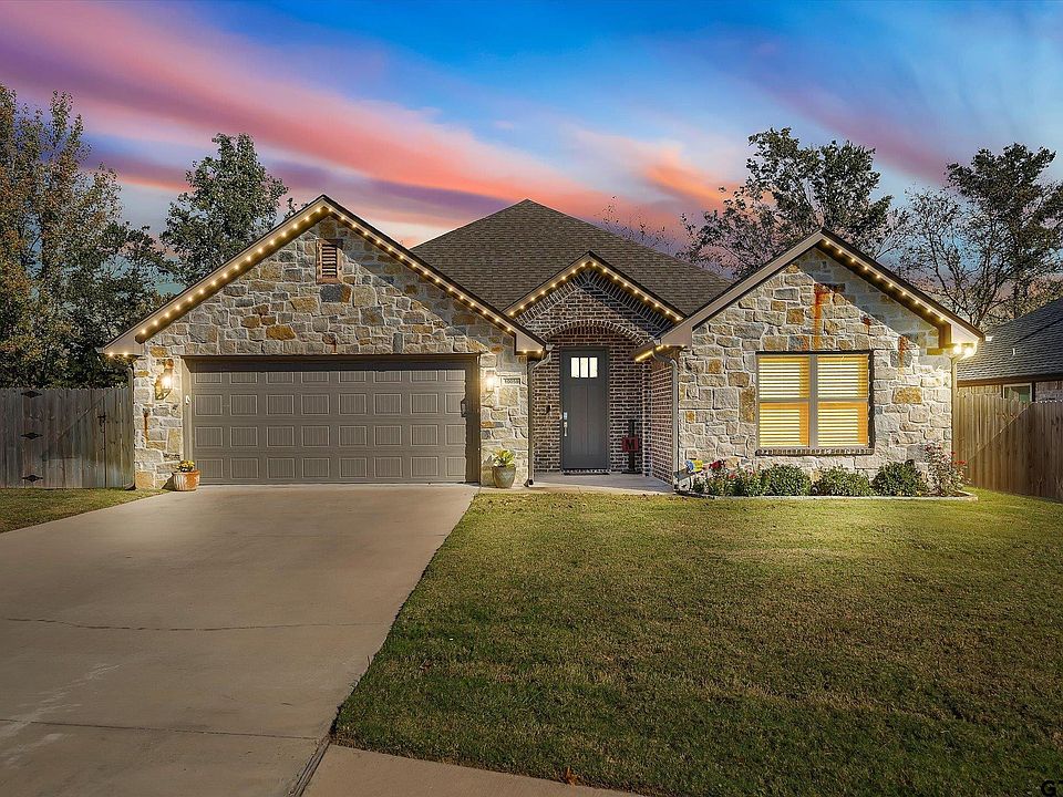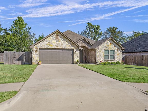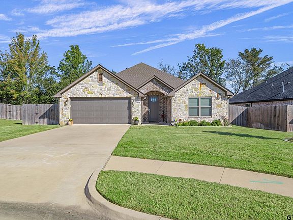 Move-in ready and beautifully finished, this home stands out in one of Flint’s favorite neighborhoods. The moment you walk in, you’ll notice the bright, open layout, tall ceilings, crown molding, and warm natural light. The living room features a cozy fireplace and flows seamlessly into a stunning kitchen with upgraded countertops, large island, gas range, custom-style cabinetry, and beautiful lighting. This kitchen truly sets the home apart from others in the area and gives it that elevated, custom feel. The primary suite is spacious and private with a well-appointed bathroom and great closet space, while the guest rooms are comfortable and tucked away for easy everyday living. Out back, you have a covered patio with ceiling fans and just enough yard to enjoy without spending your weekends maintaining it. Additional features include outdoor Jellyfish lighting, a full brick and stone exterior, wood-look flooring, upgraded fixtures and finishes throughout, and a two-car garage. Conveniently located near schools, dining, and Lake Palestine, this home is the perfect blend of comfort, style, and low-maintenance living.