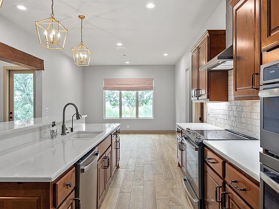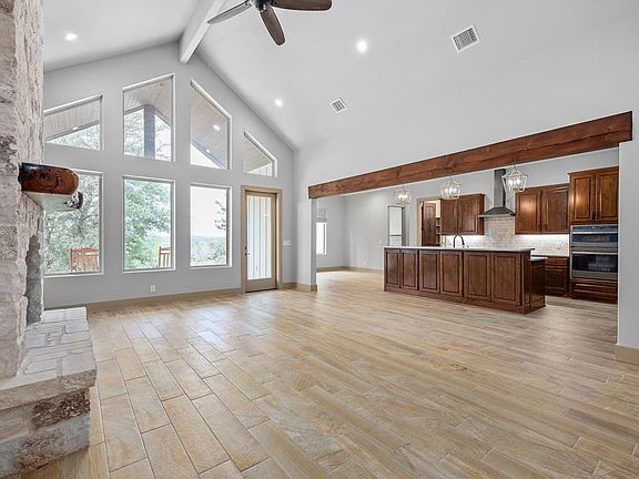 This beautiful traditional Hill Country home is located in the exclusive Comanche Trace subdivision on a half acre lot backing up to a green-space with spectacular views, wildlife and amazing sunsets! The tile floors and open floor plan, make this the perfect home for enjoying life and entertaining friends. Three bedrooms with 3 full baths, separate office area and a large open kitchen with plenty of room for seating. Solid wood doors throughout & a beautiful stone wood burning fireplace with vaulted ceiling and expansive windows in the family room. Attractive yard is low maintenance with a combination of xeriscape and astroturf. The spacious two car garage has a separate golf cart garage with entrance, water softener and instant access hot water heater. The standing seam metal roof complements the lovely stone & stucco exterior. A spacious master suite with private bath and walk-in closet flows right into the large laundry room for the utmost convenience. Memberships are available for golf and social activities.