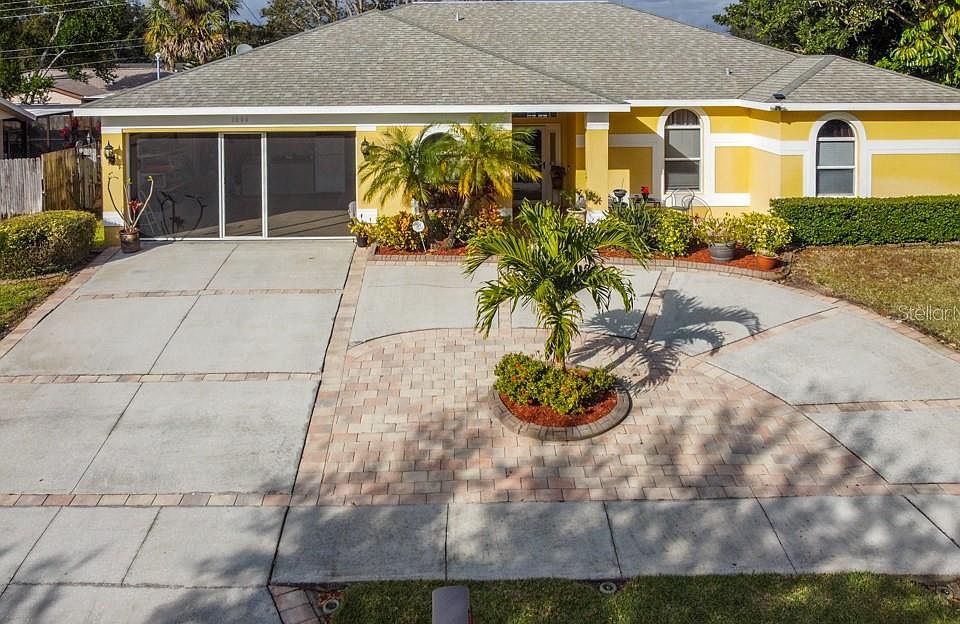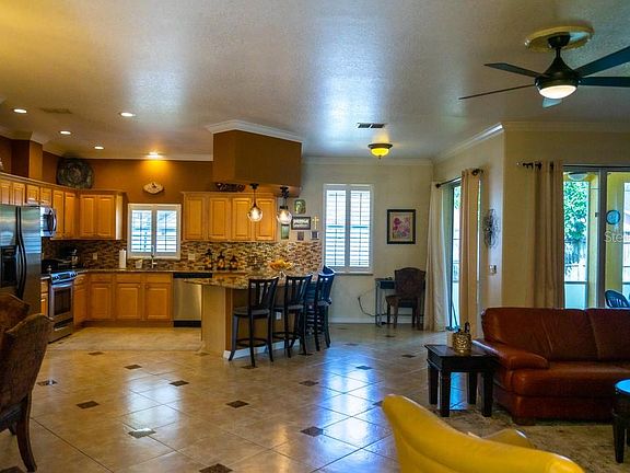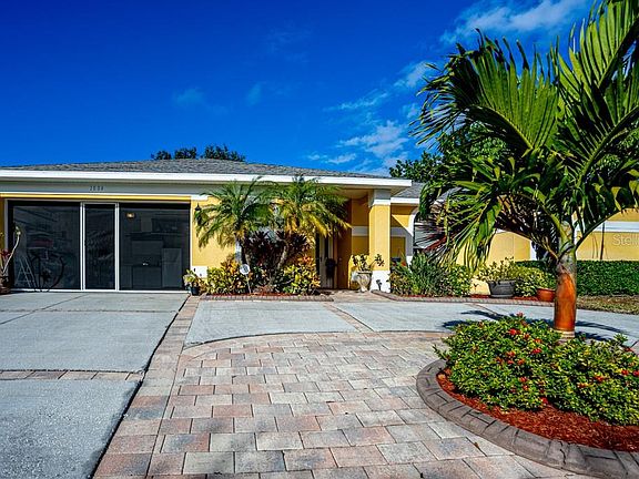 This beautiful home has been meticulously maintained by its original owners. Large open concept 3/2/2 PLUS bonus room, which can be used as an office, additional living area, or a 4th bedroom. The spacious master suite has beautiful wood flooring, his and her closets, master bath with double vanity, garden tub, and large walk in shower. Granite throughout, oversized kitchen island that seats 7-8 comfortably, stainless appliances, crown molding, built in wet bar, and a large screened in lanai. Garage has custom roll down framed screen door and plenty of room for a small workshop. Other features of this great home include alarm system, circular driveway, irrigation system on well, walking distance to beaches and schools, AC and water heater both replaced in 2016, and No Flood insurance required!