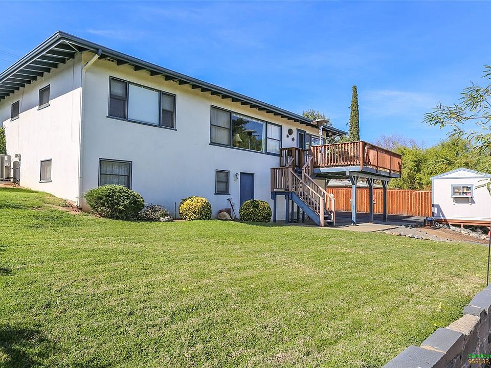 Charming Mid-Century, well cared for Home w/ Panoramic Sunrise Views from back of home on quiet street in well established, very welcoming neighborhood. Oversized "1.5" car garage w/ extra storage room & work space. Room to EXPAND or ADD On this 15,000 sq. ft. usable lot w/ lawn, garden, multiple citrus trees, horseshoe pits and plenty of room to customize to your imagination. Possible RV and/or Boat parking in addition to the garage & carport. Above the carport is an expansive "Timber Tech" Deck including stairs to the main level of the home. The Heating & A/C system, including new ducting is less than 1 year old. Other amenities include a wood burning fireplace in the cozy family room, a separate laundry room, pantry, ample sized kitchen w/ lots of natural light, direct inside access to the garage and the 3rd bedroom downstairs (currently used as a sewing/quilting room) w/ a walk-in closet. The property also offers 2 sheds (1 "Tough Shed" w/ electricity).