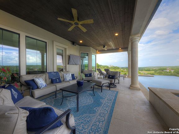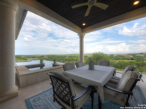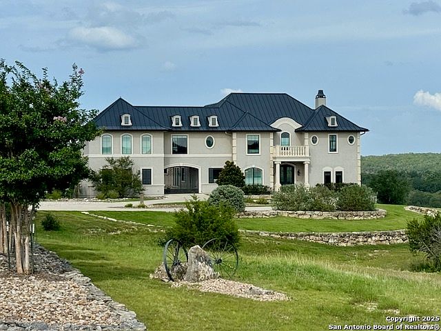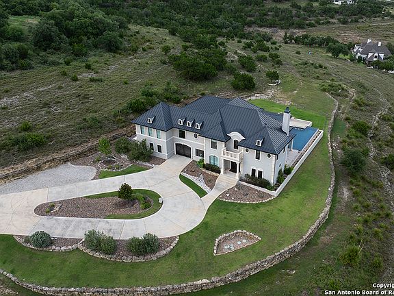 Panoramic views and timeless grandeur await at this chateauesque luxury estate on 10.8 acres in Waggener Ranch - a premier gated community known for its rare exotic wildlife herd and coveted Ag exemption. Poised atop a scenic corner parcel, this architectural masterpiece blends old-world elegance with modern sophistication, offering a lifestyle defined by refinement, privacy, and breathtaking Hill Country vistas. The stately limestone facade steeply pitched matte black metal roof, and intricate wrought iron detailing evoke the romance of a French countryside chateau, setting the tone for the craftsmanship within. Grand double doors, an elegant curving staircase, soaring ceilings, and rich hickory floors create an immediate sense of splendor where nearly every room frames panoramic views, allowing sunlight and natural beauty to pour through expansive windows. The gourmet kitchen is designed for the culinary connoisseur, boasting a Sub-Zero refrigerator/freezer, Wolf 48" dual-fuel range with double griddle, Wolf convection steam oven, Miele built-in coffee system, and dual Electrolux dishwashers. Custom cabinetry, quartz countertops, and an oversized island anchor the space, complemented by a designer butler's pantry and walk-in pantry with artisanal tile-work and ambient lighting. The first-floor primary suite is a serene retreat with private patio access, Roman shades, and a spa-inspired marble bath featuring a soaking tub, roll-in shower, and an elegant dressing closet complete with island, floor length trifold mirror, and fireproof safe. A secondary guest suite with ensuite bath and patio access offers comfort and privacy on the main level, while the upper floor hosts three additional bedrooms, a handsome library/office, and a fully equipped media room with theater seating, projector, and 7.1 surround sound. Outdoors, the estate unfolds into a private resort oasis - a heated 40' Gunite pool and spa, outdoor kitchen, smart lighting, and expansive travertine terraces framed by limestone columns. Every vantage point capture sweeping Hill Country panoramas and roaming exotic wildlife including Aoudad Sheep, Blackbuck Antelope, Arabian Oryx, Dybowski Sika, Axis, and Fallow deer. Smart-home integration enhances every aspect of living, with hardwired Wi-Fi, surveillance systems, Legrand Smart lighting, and pre-wired outlets for automated holiday displays. Climate-aware, epoxy-finished garages with built-in shelving, tankless water heater, and advanced water filtration ensure functionality meets luxury. Additional highlights include a TRX-equipped fitness studio, custom millwork throughout, dual mudrooms with built-in seating, laundry chute, back staircase, and comprehensive media and security infrastructure. Waggener Ranch is a sanctuary of estate homes on 5+ acre parcels, offering exclusive gated access, peaceful surroundings, and the rare opportunity to experience Hill Country luxury alongside one of Texas's most unique exotic wildlife herds. This Chateau Esque masterpiece is both a refined retreat and a statement of enduring elegance. AG EXEMPT.
