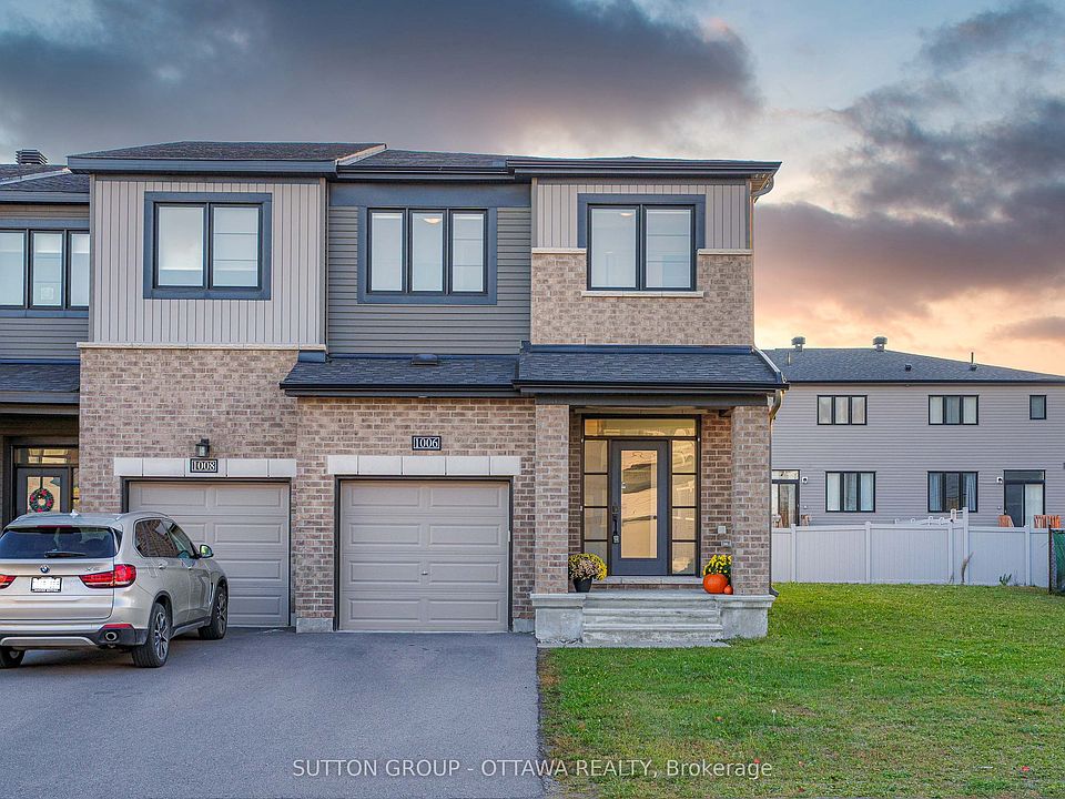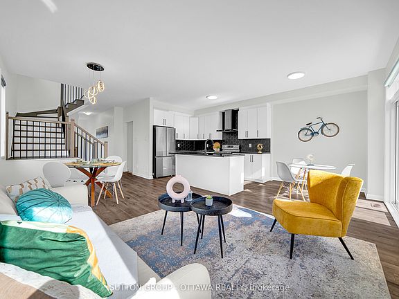 Welcome to this INCREDIBLE Tahoe End townhome, sitting proudly on a PREMIUM southwest-facing PIE-SHAPED lot in the heart of Acadia. The LOCATION is UNBEATABLE, you're WALKING distance to Kanata Centrum, Tanger Outlets, and the Canadian Tire Centre, with quick access to HWY 417, the park-and-ride, and some of the city's TOP RATED schools. Inside, the MAIN FLOOR offers 9FT CEILINGS, a RARE bonus of TWO closets for extra storage, plus a MUDROOM to keep everything organized. The OPEN CONCEPT layout seamlessly connects the kitchen, breakfast bar, dining, and living areas, with a PATIO door leading directly to the backyard. The MODERN kitchen is a total SHOWSTOPPER with SLEEK white cabinetry, DARK counters, a striking MATTE BLACK hexagon backsplash, and STYLISH BLACK fixtures, while the UPGRADED maple staircase with METAL spindles and CRISP WHITE risers adds architectural flair. This home is COMPLETELY CARPET-FREE, with HARDWOOD STAIRCASE and upgraded flooring throughout every level. Upstairs, you'll find THREE SPACIOUS bedrooms filled with SOUTHWEST SUNSHINE, along with TWO beautifully finished bathrooms & a large Laundry room. The MAIN bath features a WALK-IN glass shower with TIMELESS subway tile, DARK flooring, and QUARTZ counters, while the SPA-LIKE ensuite showcases a TILED shower framed by MATTE BLACK glass doors, a SEPARATE SOAKER tub, and ELEGANT QUARTZ finishes. Every detail has been thoughtfully UPGRADED, from the DOORS and HARDWARE to the LAUNDRY ROOM flooring. Even the FINISHED lower level impresses with a HARDWOOD staircase, an ADDITIONAL bathroom, and a HUGE versatile space ready to become a REC ROOM, HOME OFFICE, or GYM. From TOP to BOTTOM, this home has it ALL! NO CARPET, NO COMPROMISES, and NO EXPENSE SPARED. BOOK your PRIVATE SHOWING today!
