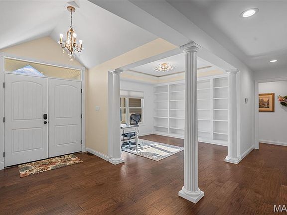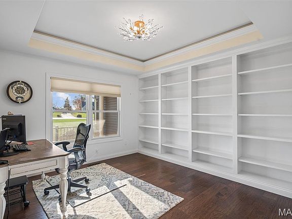 Two primary-style suites provide flexibility for extended family or guests. One suite features a wall of custom built-in bookcases, a spa-like bath with a garden tub, and a separate shower. The main floor also includes a stylish office with built-in shelving and a tray ceiling, plus a laundry room for added convenience.