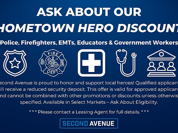 Second Avenue is proud to offer the Hometown Hero Leasing Discount Program to honor and support local heroes, including police officers, firefighters, emergency medical personnel, educators, and government employees. Eligible participants who are fully approved for a lease will enjoy a reduced security deposit on their Second Avenue home. This offer cannot be combined with other promotions or discounts unless otherwise specified. Available in Select Markets - Ask About Eligibility.