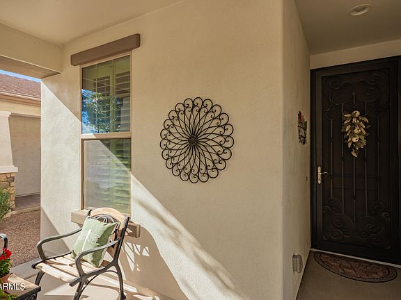 Enjoy Adult living in this beautiful home at Encore in the Eastmark Community. This 2bd/2ba home features a spacious great room with an adjacent optional den or dining room. The kitchen features granite countertops, pendant lighting, decorative backsplash, stainless appliances, huge island and spacious dining room. Beautiful shutters and shades throughout. The primary bedroom is large, the bathroom has a raised vanity, private water closet, ample walk-in-closet. There is a security door at entry, front yard porch and low maintenance landscaping. Enjoy the extended backyard paved patio, synthetic grass, full grown trees and shrubs.Encore offers resort-style amenities: heated pool, tennis, bocce, pickleball, fitness center, arts & crafts room, café, and endless activities like yoga, wo