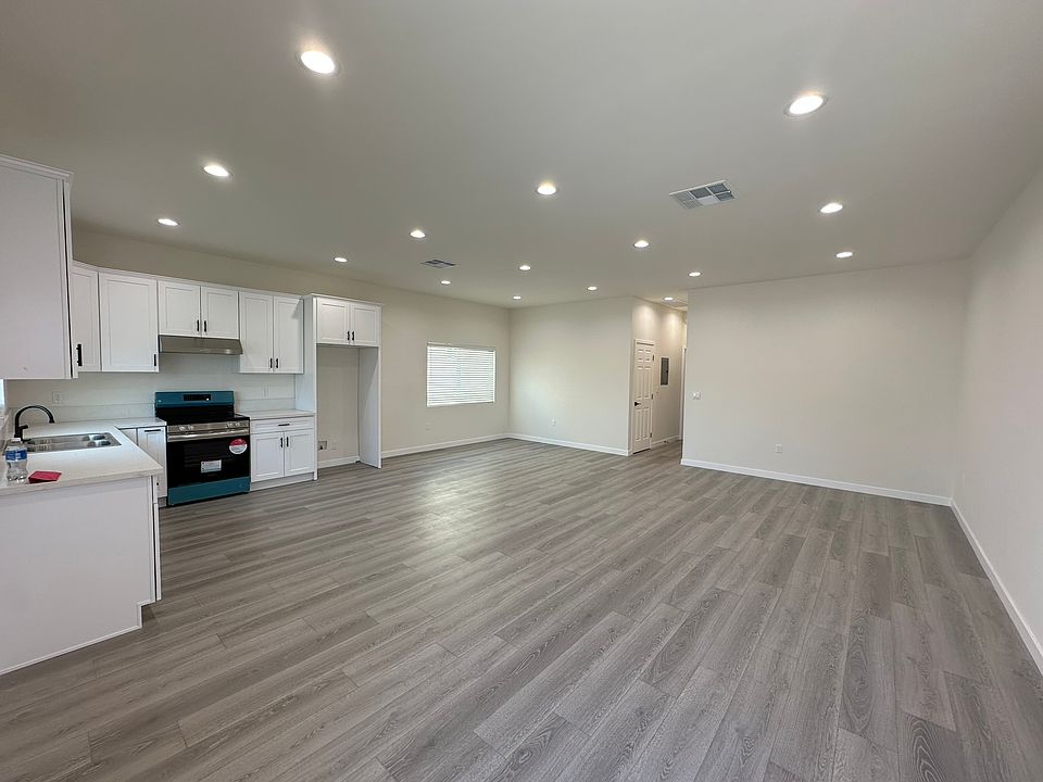 Stylish laminate flooringSolar panelsHigh ceilingsRecessed lightingSleek kitchenAssigned private parkingIn-unit washer and dryer