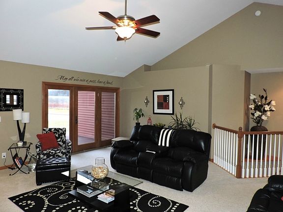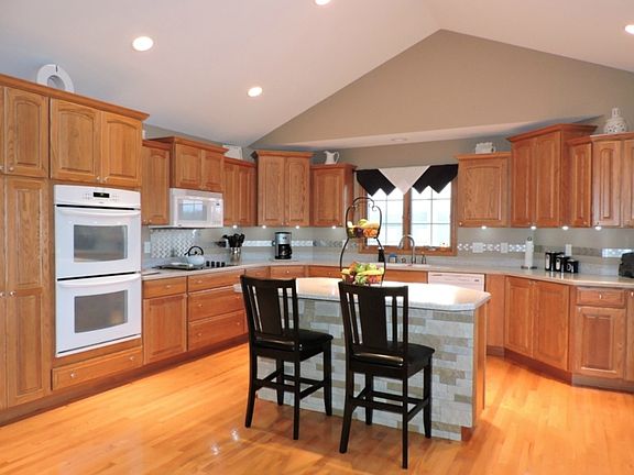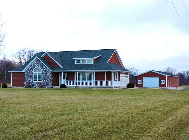 Openly Inviting...Resting on a 2.3 acre quiet country lot, the wrap-around front porch of this like-new 3 bedroom, 2.5 bath ranch beckons you to step inside! Vaulted ceilings and an open floor lend to the spacious feel of this home, while the warm wood tones and charming fireplace make it cozy. You will love the huge kitchen with its solid surface counters and great center island, as well as the sunlight-filled eating area with huge windows overl