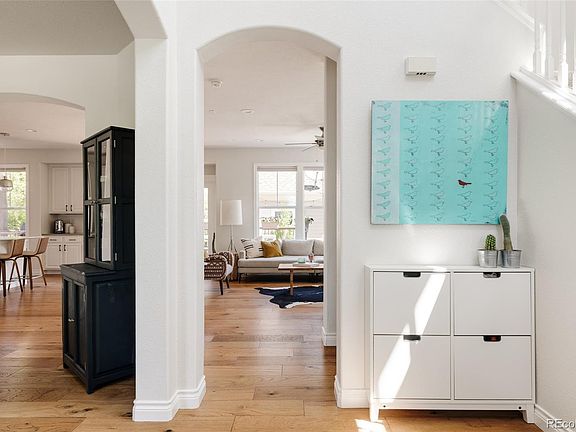 HELLO SUMMER! A BRIGHT, SPIRITED, UPDATED place in tip top shape, with FRESH FINISHES, OUTDOOR SPACE TO CHEER, and a CHOICE LOCATION too! It's just minutes from the Eastbridge Town Center, the F15 Pool, the 80-acre Central Park, wildlife trails at Westerly Creek, the Rec Center, and those fun shops and eateries at Stanley Marketplace. Better yet it’s also got an easy commute to Anschutz, DIA, and Downtown if you must go on site or just a short hop down the hall to a PRIVATE OFFICE with its second entry to that wide front porch in case your best work is done on the porch swing! Smart finishes like the on-trend wide plank light flooring, current lighting selections, shiplap wall accents, and new zellige backsplash are sure to delight. Need a nimble floor plan that zigs and zags between those hearty rambunctious gatherings as well as those quiet recharge times? It’s here in a gracious entry, formal dining, a pretty white kitchen joined to a great room anchored with a fireplace and connected to a STANDOUT YARD through nice big open windows. And wow! Let's talk about those outdoor spaces...they just might steal the show! The back offers a decked party platform for the grill with a pergola overhead, fetching privacy screening, a surprising peach tree, and a social sit and sip patio all cleverly arranged just off that treasured 3 CAR GARAGE that comes with high ceilings for extra storage space and a workbench too. The front greets friends with care-free perennials, shade trees, and raised garden beds that make growing enviable heirloom tomatoes a breeze. And then for ‘Practical You’, there’s a FULLY FINISHED BASEMENT with a snappy wet bar to serve up snacks and beverages during movie night, a workout space with mirrors and padded flooring for good form, and a GUEST ROOM with an ENSUITE BATH. Top that with a kitchen pantry, upstairs laundry, and loads of seasonal storage and boom….you’ve probably just checked all those boxes!