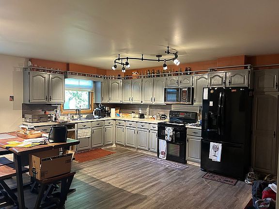 Don't let this home pass you by! The large kitchen/dining area is the first thing to catch your eye after you've stepped in from the attached garage. The kitchen cabinets have been beautifully redone in a 'weathered wood' color. There is a bright and comfortable living area upstairs and down the hall a bathroom and two bedrooms. The larger of the two bedrooms has original hardwood floors that have