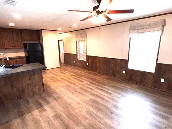This like-new 2020 Clayton Hunter home has over 1200 square feet and has 3 bedrooms, 3 full baths, and 3 walk-in closets. Yes, each BR has a private bath and its own walk-in closet. All 3 bedrooms are the same size. The home also has roomy 8 ft ceilings with recessed LED lighting and ceiling fans in the LR and all bedrooms. The entire home is wrapped in sturdy OSB siding under the vinyl siding. It also has extra insulation in the walls and ceiling, and low-E double-pane windows for LOW power bills. The heating and air vents are located in the ceiling, so your furniture or rug won't cover your vents. The home is totally electric and has central heat and air, and a digital thermostat you can control from your smartphone from wherever you are. Other features: upgraded 50-gallon water heater so you don't run out of hot water, steel front door and cottage-type steel rear door, separate laundry room with a pantry wired for a stand-up freezer, open concept kitchen/living area with new black Frigidaire stove with glass tile backsplash, black fridge with ice maker and dishwasher. The kitchen sink has a goose-neck sprayer. Fully lined cabinetry throughout and transom windows, which add extra light. Each bathroom features a sit-down 60" one-piece fiberglass shower with glass doors, china sinks, and towel and tissue holders built in. Built-in entertainment center for your big screen TV, linoleum flooring throughout for durability and easy clean-ups. Large covered deck for entertaining with full-width steps for easy entry and exit.