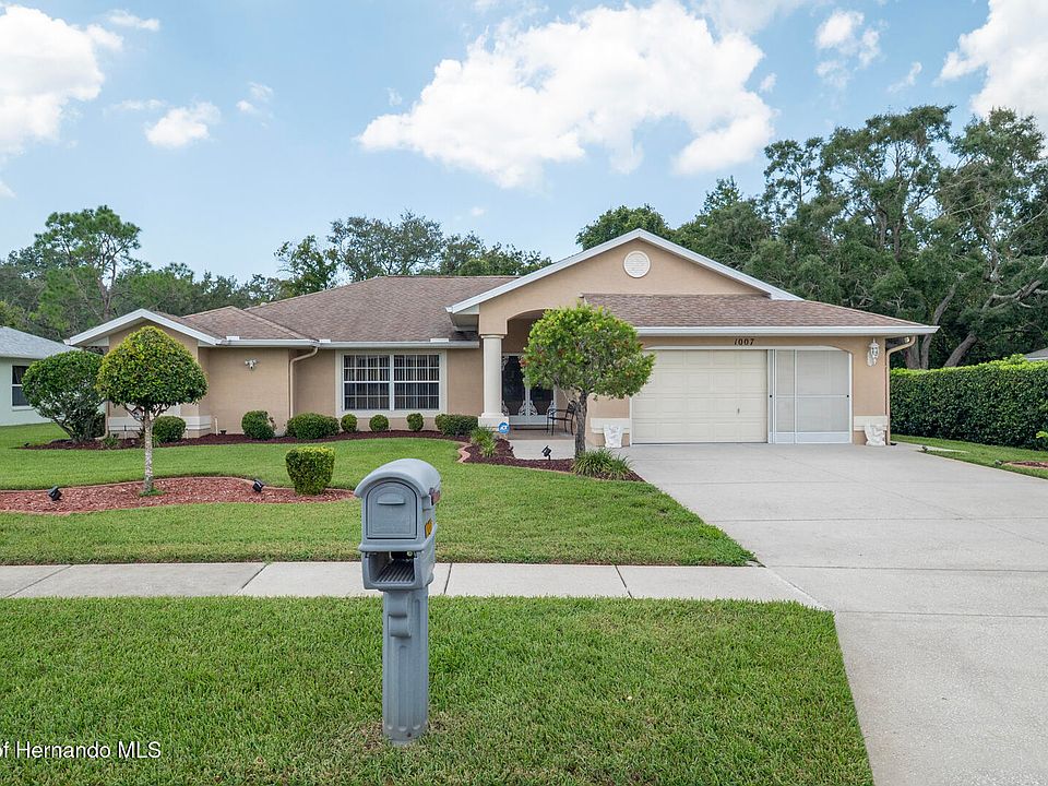 This beautifully maintained single-family home offers 3 spacious bedrooms, 2 full bathrooms, and nearly 2,000 square feet of comfortable living space. From the moment you step inside, you'll be greeted by the timeless charm of real hardwood floors, elegant tile, and sun-filled rooms that create a warm, welcoming atmosphere. The thoughtfully designed floor plan flows seamlessly, making everyday living and entertaining a breeze. Your attached 2-car garage offers convenience and extra storage, while the heart of the home leads you outdoors to a private backyard retreat — complete with a sparkling, self-cleaning pool and a working sprinkler system to keep your landscape lush and vibrant. Relax, host gatherings, or simply enjoy Florida's sunshine year-round. Evenings are enhanced by elegant electric front spotlights that add both beauty and security to your home's curb appeal. Ideally located, this home is just minutes from scenic hiking and biking trails, popular restaurants, quality hospitals, and the Suncoast Parkway — providing an easy 40-minute commute to Tampa International Airport and world-class shopping malls. Don't just imagine it — come experience it for yourself. Schedule your private showing today and make this dream home yours!ng today and make this dream home yours!