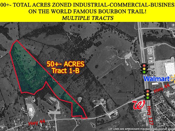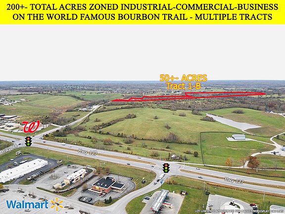 TALK ABOUT LOCATION, LOCATION, LOCATION!!! This exceptionally located property sits at the intersection of directly on the World Famous Bourbon Trail and is located at the JCT of HWY 127/HWY 44. Property contains a total of up to 200+- acres and is zoned for Industrial-Business-Commercial mixed uses. THERE IS ALSO OTHER LAND OPTIONS HERE WHICH CONTAIN HARD CORNERS @ MULTIPLE TRAFFIC LIGHTS WITH DIRECT ACCESS TO THE PROPERTY ACROSS FROM WAL-MART, WAL-GREENS, AND MANY MORE! Property lends itself well for approximate 50 front acres to be utilized for commercial (Restaurants? Hotels? Retail? Brewery? Service Stations?) and approximate 150 acre rear portion to be utilizes for industrial (Bourbon Warehousing? Manufacturing plants? Distilleries? Industrial Factories?) Huge natural gas, electric, public water, public sewer, multiple manholes all available at the property. Seller may consider selling in 20 acre tracts minimum on certain portions of the property. Call today to schedule your showing!
