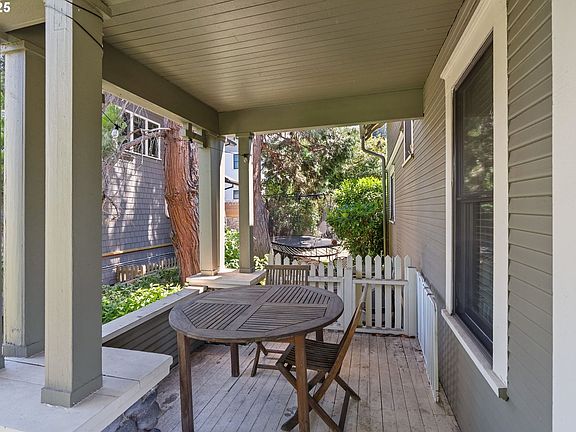 Step into timeless charm with this 1916 Hood River classic cottage, ideally located on a quiet street just minutes from downtown. This 3-bedroom, 2-bathroom home offers 1,360 square feet of well-maintained living space. Enjoy glimpses of the Columbia River and views of the Washington hills from the private deck off the upstairs primary bedroom. The main level features wood floors in the entryway, living room, and spacious dining area, plus a full bathroom. The updated kitchen includes stainless steel appliances, tile floors, and warm butcher block countertops, with a sunny porch just beyond. A large covered front porch adds to the home's inviting curb appeal. Both the front and back yards are fully fenced with a charming white picket fence, while mature landscaping provides beauty and privacy. A detached 1-car garage and private driveway offer off-street parking. The large basement provides ample storage and includes laundry. A rare combination of character, comfort, and location!