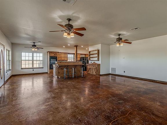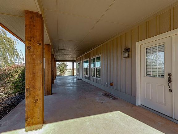 Experience country living at its finest on 5 beautiful acres! This spacious home features two oversized bedrooms and three full bathrooms, designed with comfort and functionality in mind. Enjoy stained concrete floors, custom western-style cabinetry, and an inviting open-concept kitchen and living area that’s perfect for hosting family and friends. The kitchen offers a large island bar with plenty of prep and seating space. The primary suite is a true retreat with access to the fully covered wrap-around porch, ideal for quiet mornings or evening sunsets. The ensuite bathroom includes a relaxing jetted tub and a generously sized walk-in closet. The laundry room is extra spacious, providing storage and convenience. Outside, the property is cross-fenced and ready for animals, complete with two livestock barns: South Barn: 10x24 with feed/tack room North Barn: 12x24 with two separate stalls
