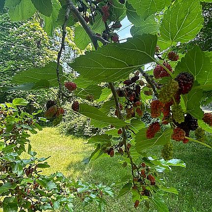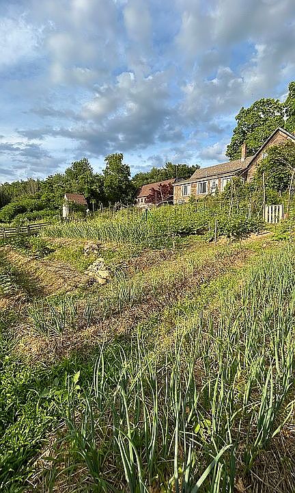 3 acres open pasture, giant Mulberry tree, old apple trees. Some maples for sugaring. Large tilled veggie garden area, wild grapes and berries.