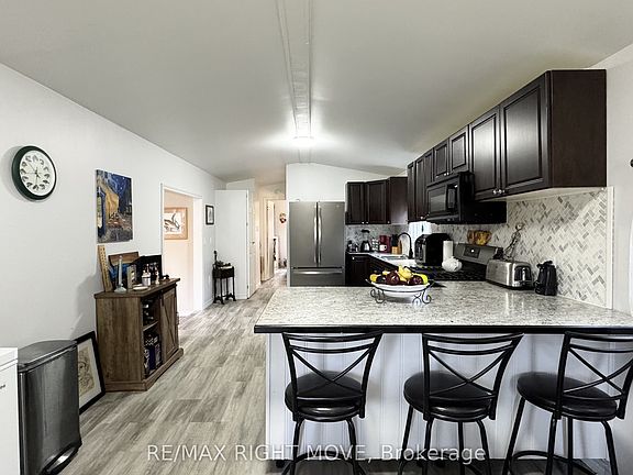 Affordable Year-Round Living in Beautiful Muskoka - 2 Bedroom Mobile Home in SunPark Beaver Ridge Estates. Enjoy peaceful, affordable living just minutes from Gravenhurst in this charming 2-bedroom, 1-bathroom mobile home located in the sought-after SunPark Beaver Ridge Estates community. Perfect for year-round living, this well-maintained home offers a comfortable and inviting atmosphere surrounded by the natural beauty of Muskoka. Step inside to a spacious kitchen featuring a stainless steel refrigerator, propane gas stove, built-in microwave, and a 3-seat bar counter - ideal for casual dining or entertaining. The home features a mix of hardwood and vinyl/laminate flooring, in-unit laundry, and a large foyer that adds extra space and functionality. Outside, you'll find a paved single driveway and a large outdoor storage shed, perfect for tools, bikes, or seasonal gear. Located within SunPark Beaver Ridge Estates, residents enjoy a friendly, well-managed community with beautifully landscaped grounds, scenic ponds, fishing spots, and nature trails. The on-site recreation centre offers a fully equipped kitchen, pool, patio, and BBQ area, making it easy to relax and connect with neighbours.Experience the best of Muskoka living - peaceful surroundings, natural beauty, and the convenience of being close to the shops and services of Gravenhurst - all at an affordable price.