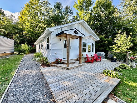 Immaculate year-round mobile home in Sunpark Beaver Ridge! This completely renovated, spacious 925 sqft unit boasts 2 bedrooms, 1 bathroom and a large workshop/shed. One of the most prized locations and lots in the park with 5 car parking and circular driveway, most units only have 1-2 spaces. This high and dry location gives an elevated view over the pond and back crown land forest, phase 3 is further from any highway noise, and there are no neighbors on 3 sides of this location including a very private forested backdrop with exposed granite. Since the owner bought in 2016 they have completed extensive renovations: full 2x6 walls with insulation and vapor barrier (except 1 bathroom wall), topped up insulation in attic, 3 year old furnace, new kitchen, flooring, pot lights, wood tongue and groove ceiling, appliances, plumbing, windows and the back shed/workshop area which is second to none. This would make a great retirement residence, perfect or someone looking to downsize or an affordable starter home. 2 minutes to Gravenhurst for grocery stores, medical center, restaurants and amenities, you are in the country but very close to everything. Book your showing today before its gone! New Owner Landlease fees: $895/month, water testing $69.99/month, taxes $56.29/month. Utilties and insurance are extra. Owner maintains their own property.