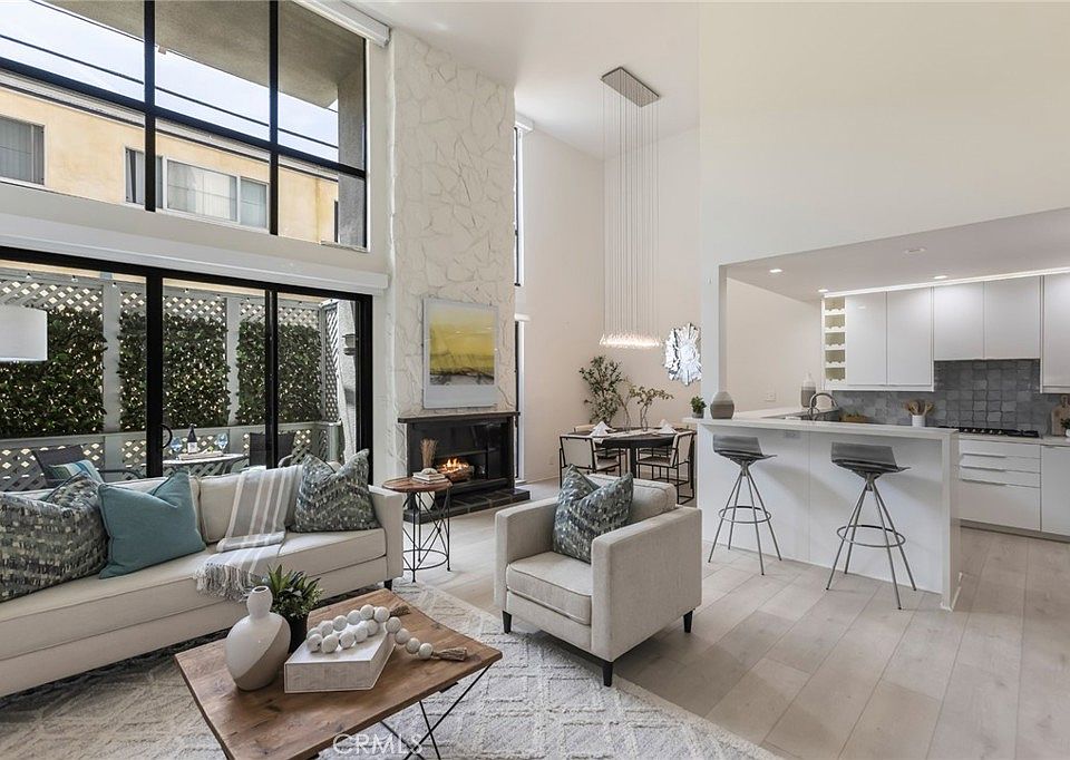 Soaring two-story ceilings and floor-to-ceiling windows flood the home with natural light, while a gas fireplace adds warmth and style. The modern kitchen offers sleek finishes ideal for both everyday living and entertaining.