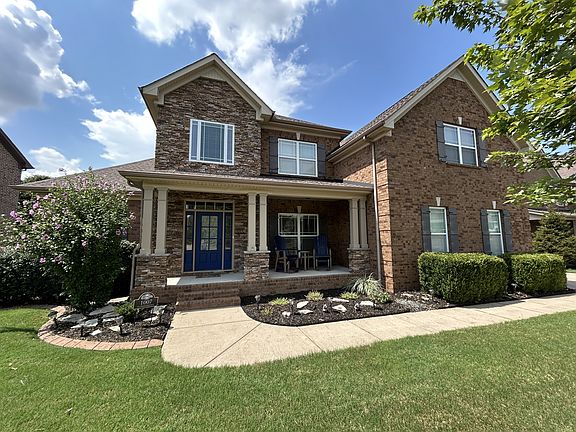 Beautiful Benevento East home! All brick traditional home, featuring a rocking chair front porch. Your guests are welcomed by a gorgeous 2- story front foyer, extra wide staircase, and top landing overlooking foyer and great room. The formal dining room can be used for formal entertaining or it can be easily converted into an office / flex area. The great room with vaulted ceiling and wood burning fireplace, makes this space especially warm and inviting. Kitchen has granite countertops, plenty of cupboard space, and a pantry for all of your overflow. Hardwood floors throughout main living areas. The first floor features the primary suite as well as a secondary bedroom and full bath. Great floor plan for multi-generational living. The primary bedroom features an en suite with a huge walk in closet, double sinks, gorgeous oversized shower, and separate water closet. Upstairs has two bedrooms, a full bath, and oversized bonus room with vaulted ceilings. Enjoy evenings in your private backyard on the covered patio. Plenty of parking on your extensive concrete driveway. Property close to the new June Lake and I-65. Easy commute to Franklin and Nashville. Close to a wealth of grocery stores, restaurants, and shopping. Hot tub in backyard does not convey. Garage refrigerator stays!