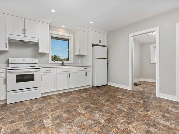 Vinyl windowsAsphalt shinglesCute covered front porchFresh and chic kitchenClean white cabinetryMatching appliancesLarge window