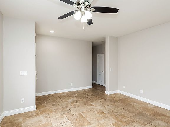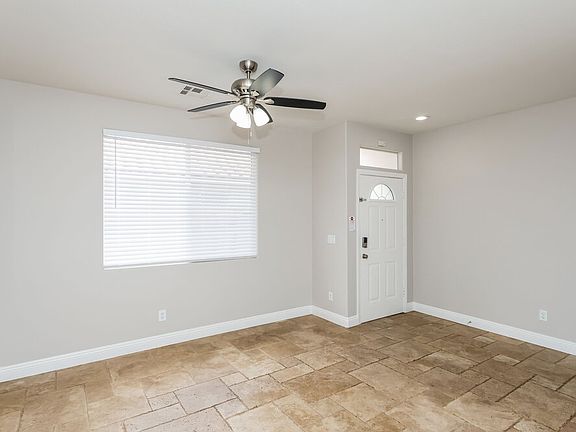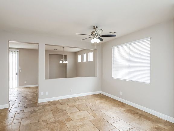 Enjoy having three bedrooms and two bathrooms when you move into this beautiful single-story rental home in Henderson, NV. Spanning 1,400 square feet, the property includes an attached garage and a pet-friendly enclosed yard with a concrete back patio. Neutral gray walls and a big window treated with white blinds welcomes you into the spacious living room, which is a comfortable space with a lighted ceiling fan. The kitchen boasts a roomy dining area with a pretty chandelier and comes with modern appliances and a built-in microwave. You'll have plenty of privacy in the primary suite, which is set apart from the other bedrooms. It comes with an en suite bathroom offering two vanity sinks. Don't wait to book your in-person tour!